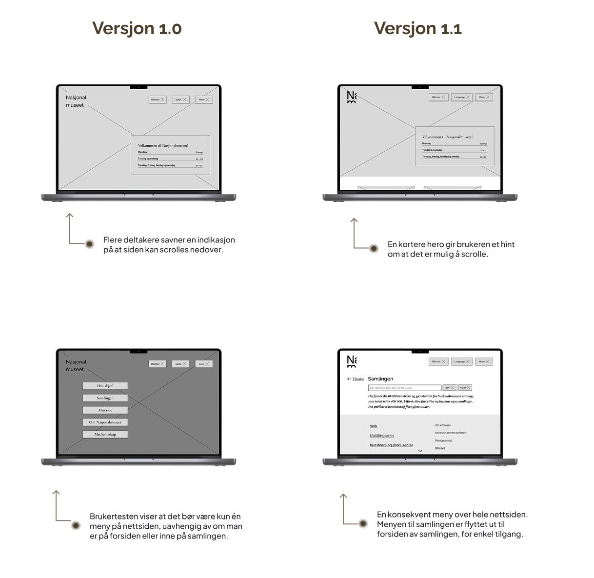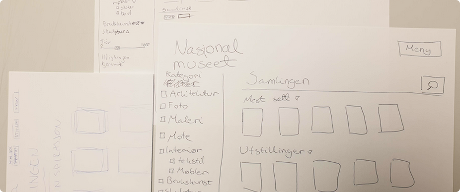 Etter at vi hadde gjort om første utkast av prototypen, startet vi på en mer detaljert høyoppløst versjon. Vi valgte å følge Nasjonalmuseet’s visuelle profil, slik at vi kunne bruke mer tid på å forbedre informasjonsstrukturen og brukeropplevelsen for målgruppen vår.