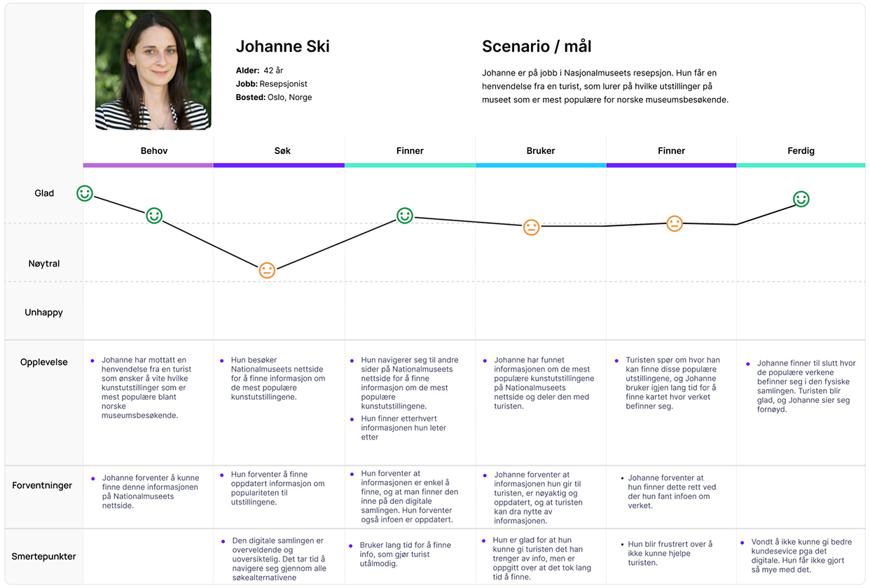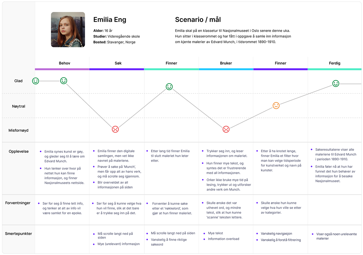 Vi utviklet brukerreiser for to personas for å identifisere smertepunkter, forventninger og erfaringer med den eksisterende løsningen. Dette ga oss bedre forståelse for hvordan brukerne samhandler med tjenesten over tid, samt deres opplevelser, behov og følelser gjennom hele brukerreisen.