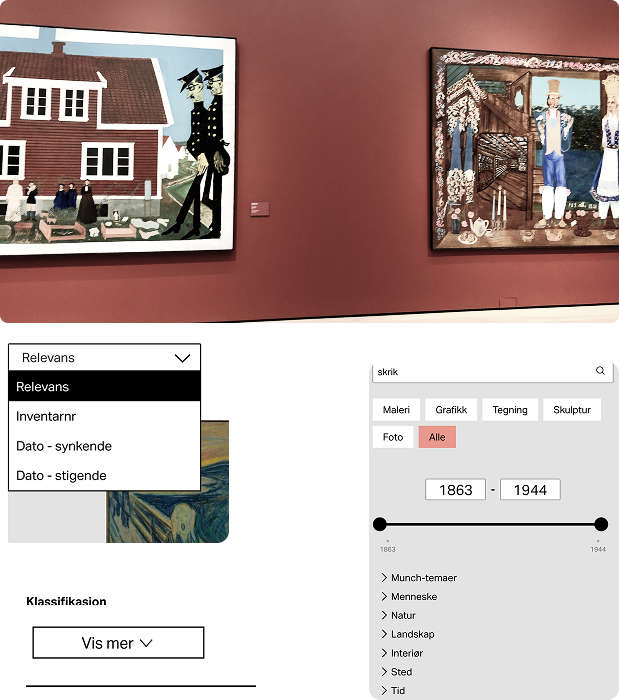 Vi gjennomførte også en konkurrentanalyse av Munchmuseet’s nettside og fant flere inspirerende funksjoner, blant annet filtrering av samlingen, sorteringsmuligheter for søkeresultater, en «Se mer»-funksjon for detaljer, samt tematisk kategorisering som natur, interiør og landskap.