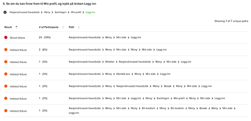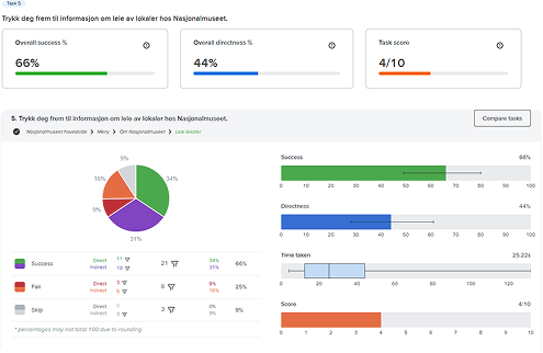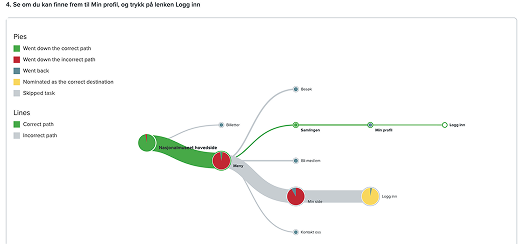Vi gjennomførte også en Treejack-test. Målet var å vurdere hvor godt meny-navigasjonen i den eksisterende løsningen fungerte. Analysen av testen viste følgende: