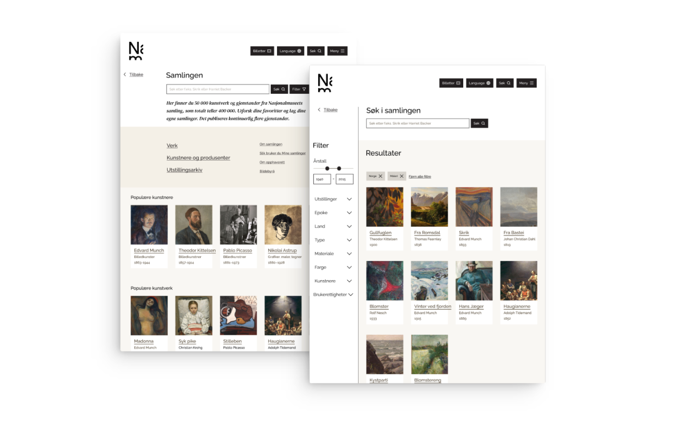 Gjennom denne prosessen bestemte vi oss for å implementere en filtreringsfunksjon på venstre side av nettsiden, slik at brukerne kan velge hva de ønsket å se. Vi valgte også å vise «Mest sett», «Utstillinger» og «Hele samlingen» på forsiden av den digitale samlingen.