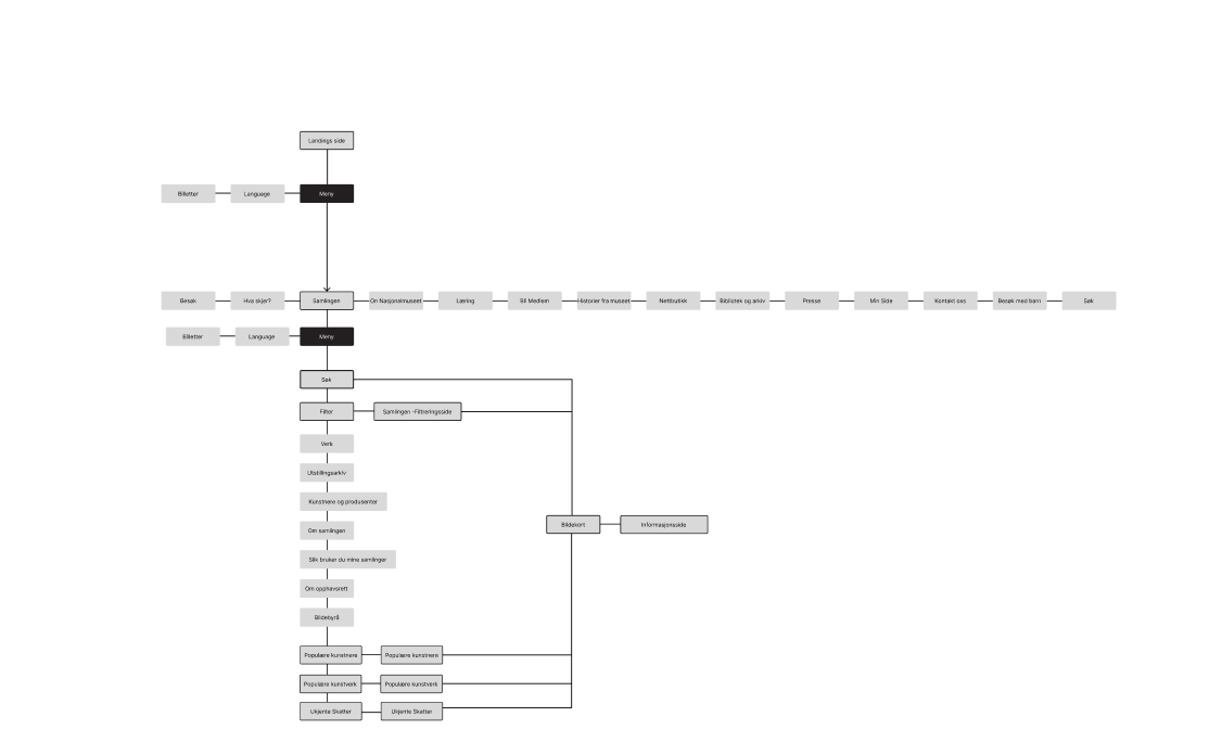 Deretter laget vi en oversikt over hvordan siden ville se ut i vår løsning. Vi tok kun med veien fra Nasjonalmuseet’s hovedside til samlingen, og navigasjonen videre derfra. Dette gjorde vi for å fokusere på de delene vi faktisk endret, siden arbeidet vårt handlet om å forbedre samlingen.