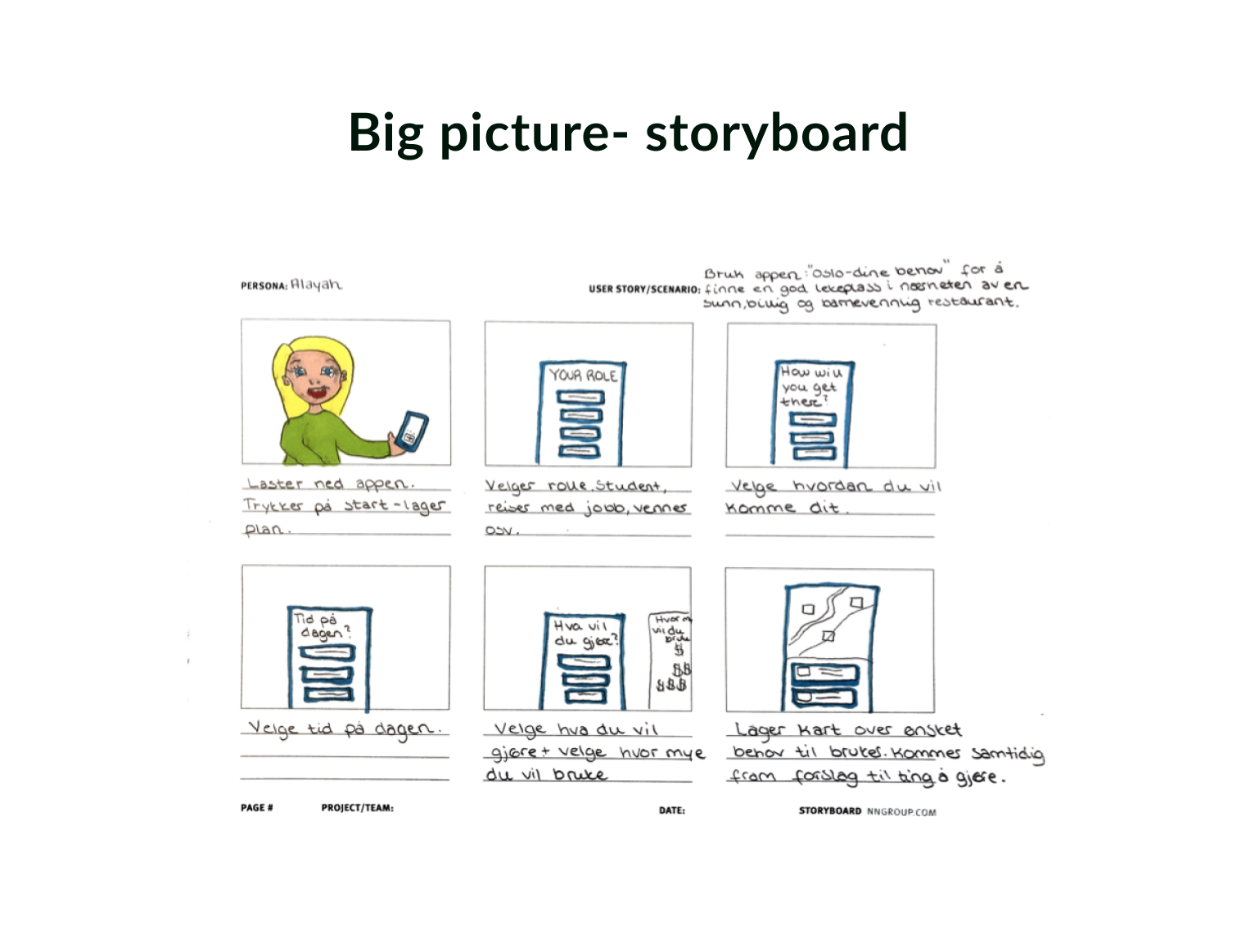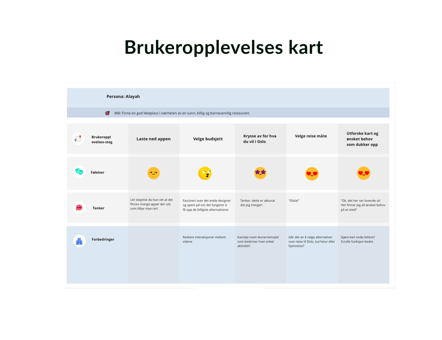 Jeg valgte deretter å bruke “Big picture”- metoden for å gi meg oversikten jeg trengte for å mer forstå brukerens helhetsopplevelse. Deretter valgte jeg å sette opp et brukeropplevelseskart for å hjelpe med å forstå hvordan brukeren faktisk opplever tjenesten – ikke bare hva de gjør.